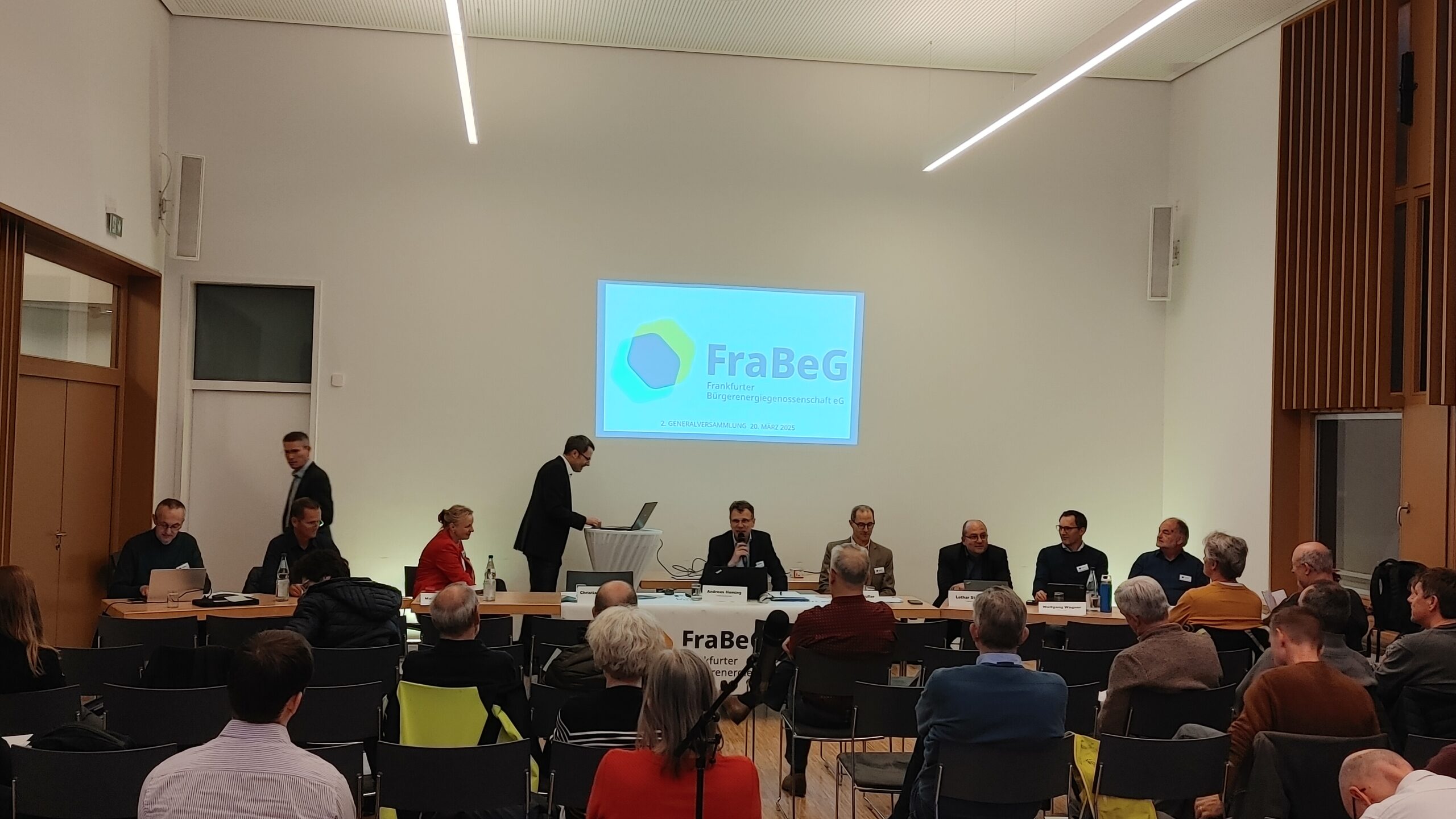 Die Frankfurter Bürgerenergiegenossenschaft (FraBeG) hat einen weiteren wichtigen Schritt in ihrer Entwicklung genommen. Bei der 1. ordentlichen Generalversammlung am 20. März 2025 in Frankfurt-Riedberg wurden Vorstand und Aufsichtsrat einstimmig bei jeweils nur wenigen Enthaltungen von den Mitgliedern der FraBeG entlastet.