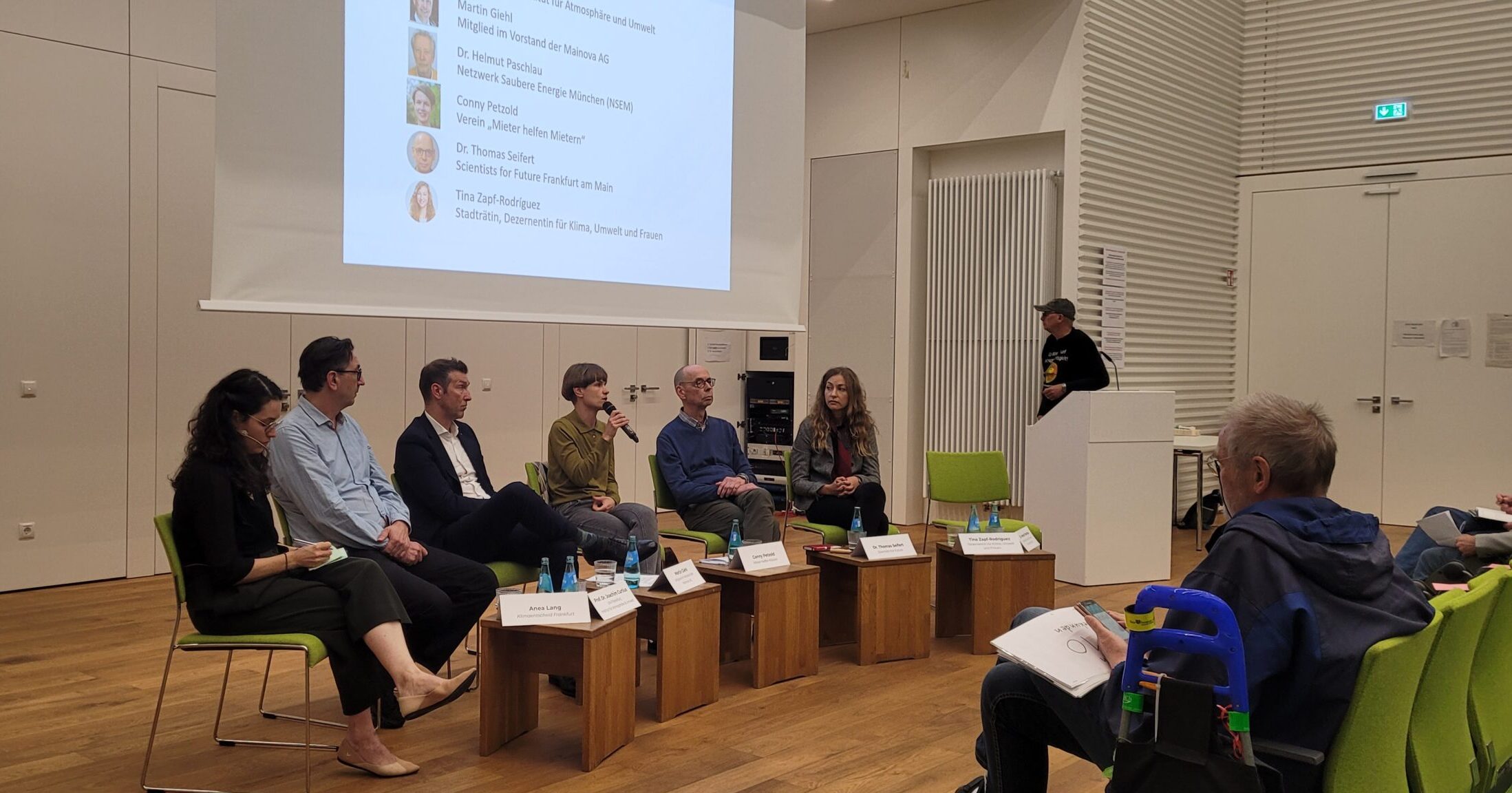 Titelbild: Conny Petzold (mit Mikrofon) vom Verein Mieter helfen Mietern warnte bei der Podiumsdiskussion vor den sozialen Folgen einer Heizkostenexplosion im Zuge der Wärmewende.